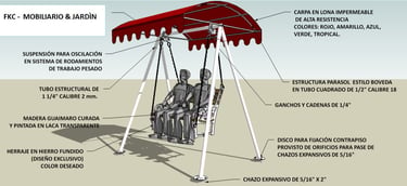 Estructuras metálicas robustas, madera curada y sistemas de suspensión de trabajo pesado garantizan seguridad y durabilidad. La cubierta tipo parasol en lona impermeable o policarbonato alveolar brinda protección y estilo, adaptándose a jardines, terrazas, parques y espacios sociales.